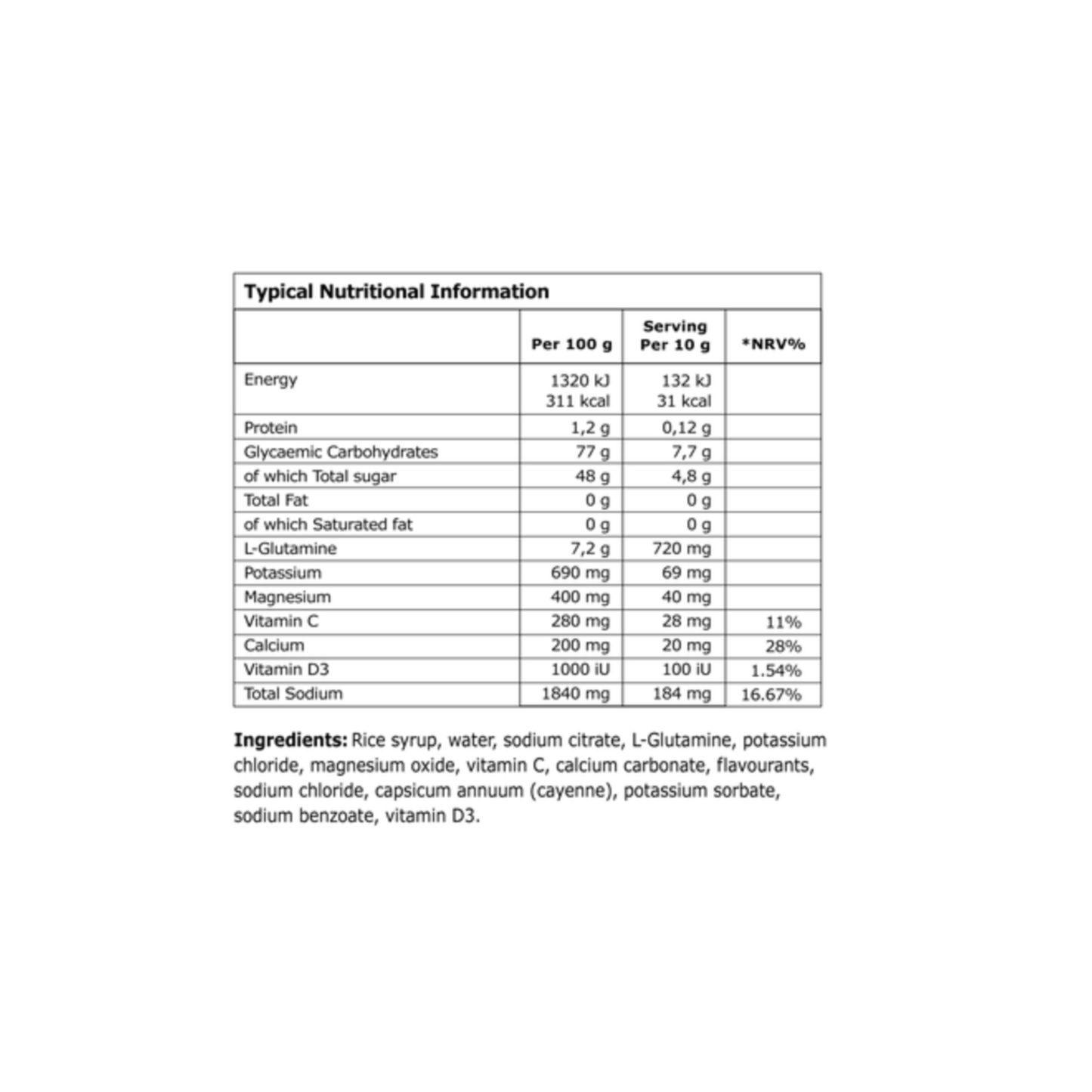 Packed with 6 power vitamins & minerals – 184 mg Sodium, 69 mg Potassium, 40 mg Magnesium, 28 mg Vitamin C, 20 mg Calcium, and 100 iu Vitamin D3 - per sachet.