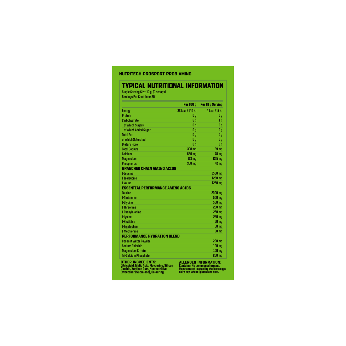 NUTRITECH ProSport Pro9 Amino has been designed for any athlete competing in sport looking for an EAA muscle recovery drink. ProSport products are Informed Sport Certified – Every Batch Tested. Muscle hydration and recovery. Recover faster with all 9 essential amino acids.